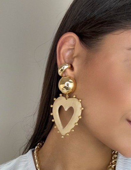 Este brinco em formato de coração, confeccionado em madeira, ganha ainda mais charme com o detalhe das bolinhas, que acrescentam movimento e sofisticação à peça.