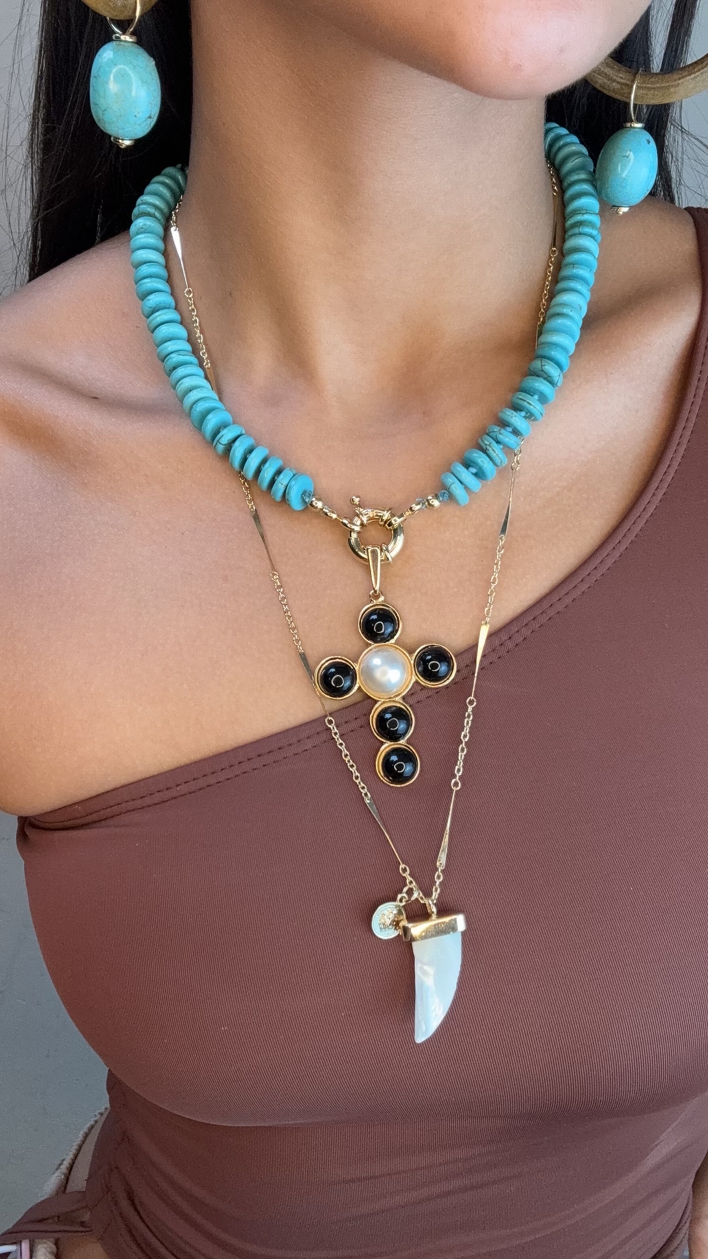 COLAR LONGO COM PINGENTE DE DENTE DE MADRE PEROLA