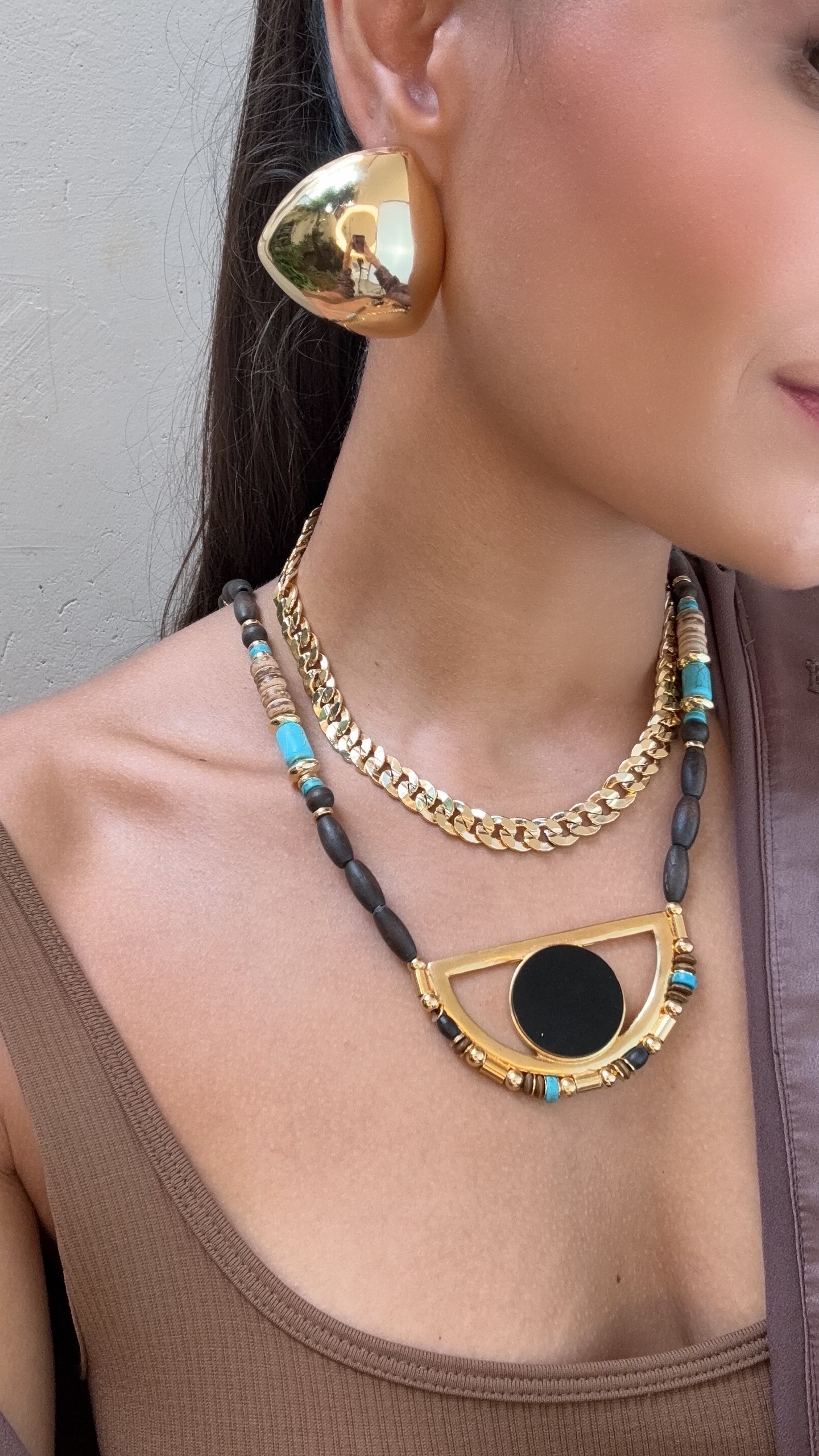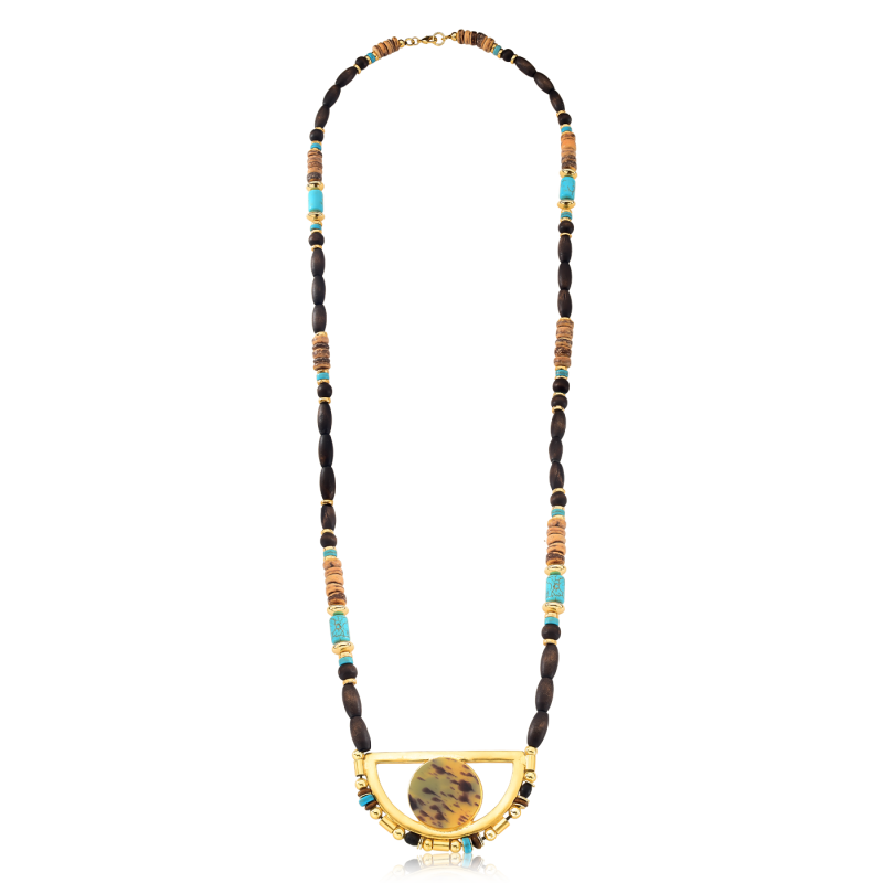 Este colar longo é uma semi-jóia que une a leveza da madeira ao frescor da turquesa, criando uma combinação única e cheia de estilo. O pingente em meia lua acrescenta um significado especial, representando renovação, feminilidade e equilíbrio.