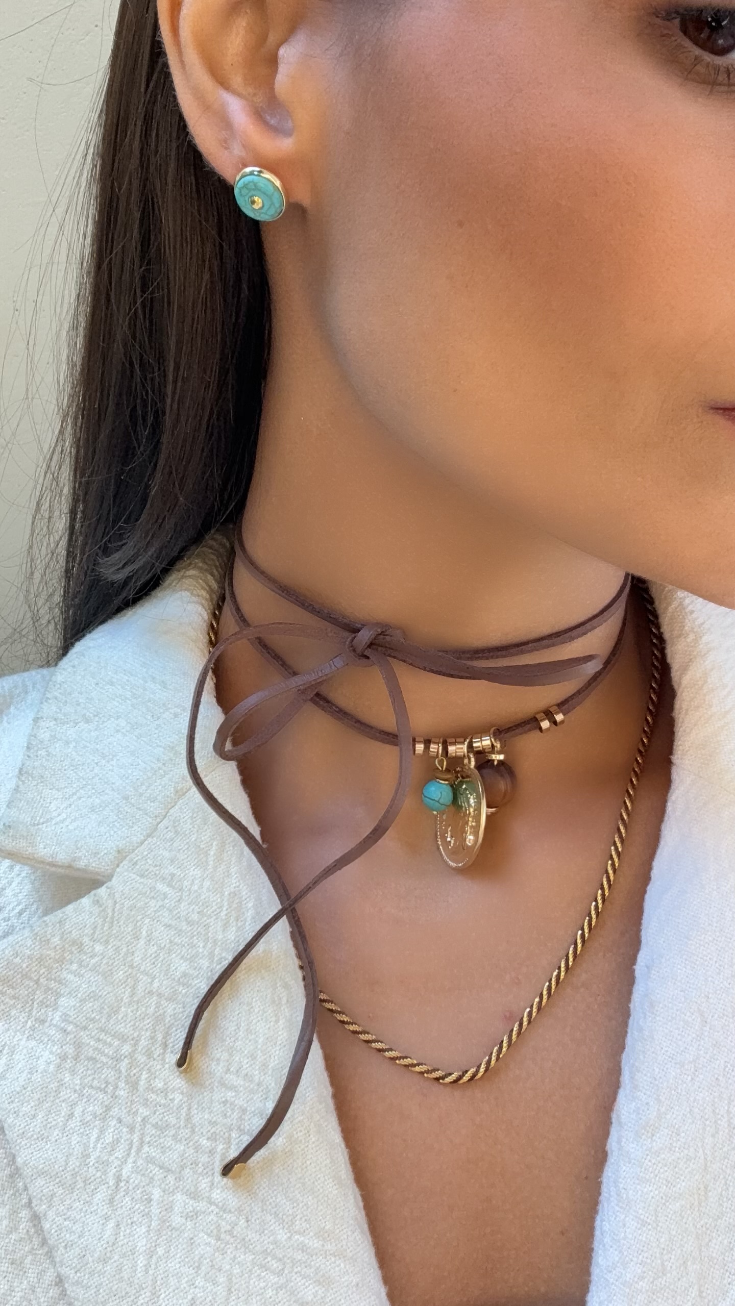 O cordão em couro de 1,20m combina a força e modernidade do material com a delicadeza dos pingentes, criando um acessório versátil e cheio de personalidade. Seu comprimento diferenciado permite composições criativas, seja em camadas ou usado de forma única para destacar ainda mais o visual.